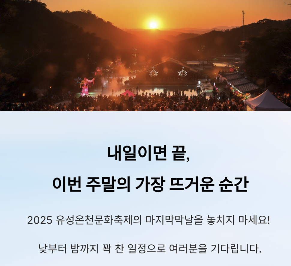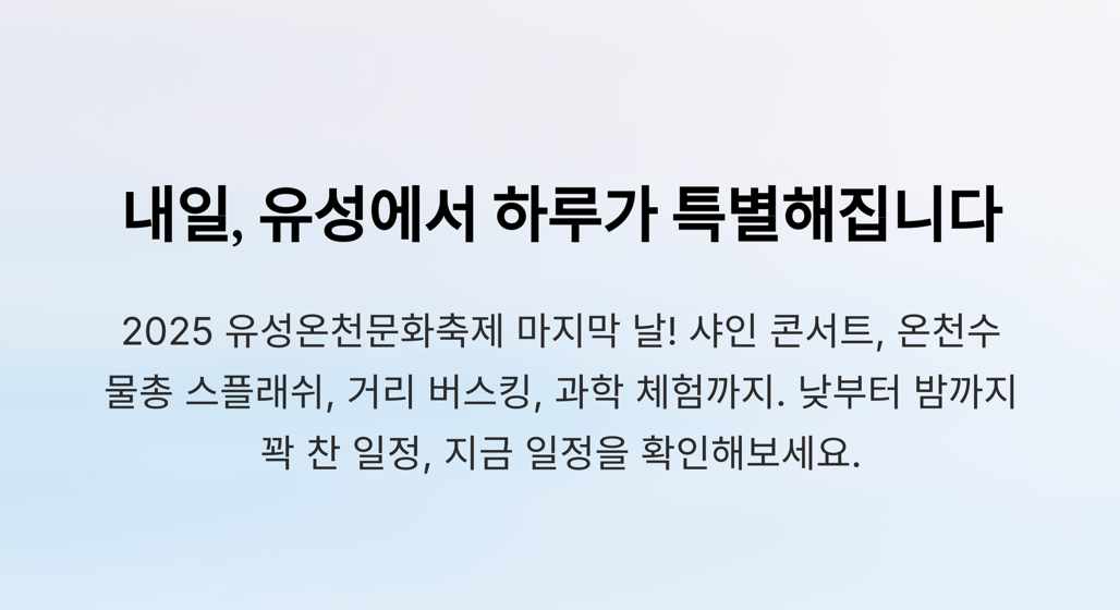 2025 유성온천문화축제는 온천수, 음악, 과학이 함께하는 복합 문화축제로 자리 잡았습니다. 이번 글을 준비하면서 축제의 세부 일정과 흐름을 한눈에 파악할 수 있었고, 여러분도 남은 하루를 알차게 계획하는 데 도움이 되셨으면 해요. 직접 다녀온 후기가 아닌 만큼 정보에 다소 차이가 있을 수 있지만, 축제에 대한 애정을 담아 최대한 객관적으로 정리해 봤습니다. 오늘 하루도 즐거운 나들이되시길 바랍니다!