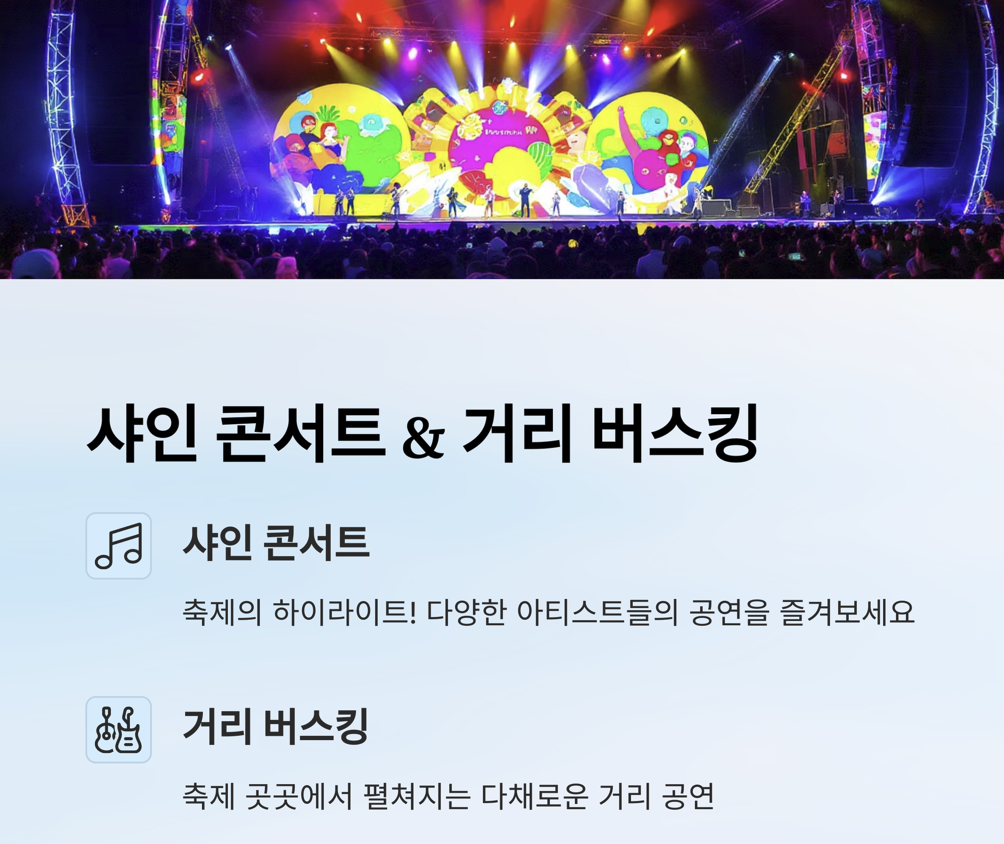 - 주요 행사: 샤인 콘서트(14시), 물총 싸움(15시), DJ 파티(18시~)
