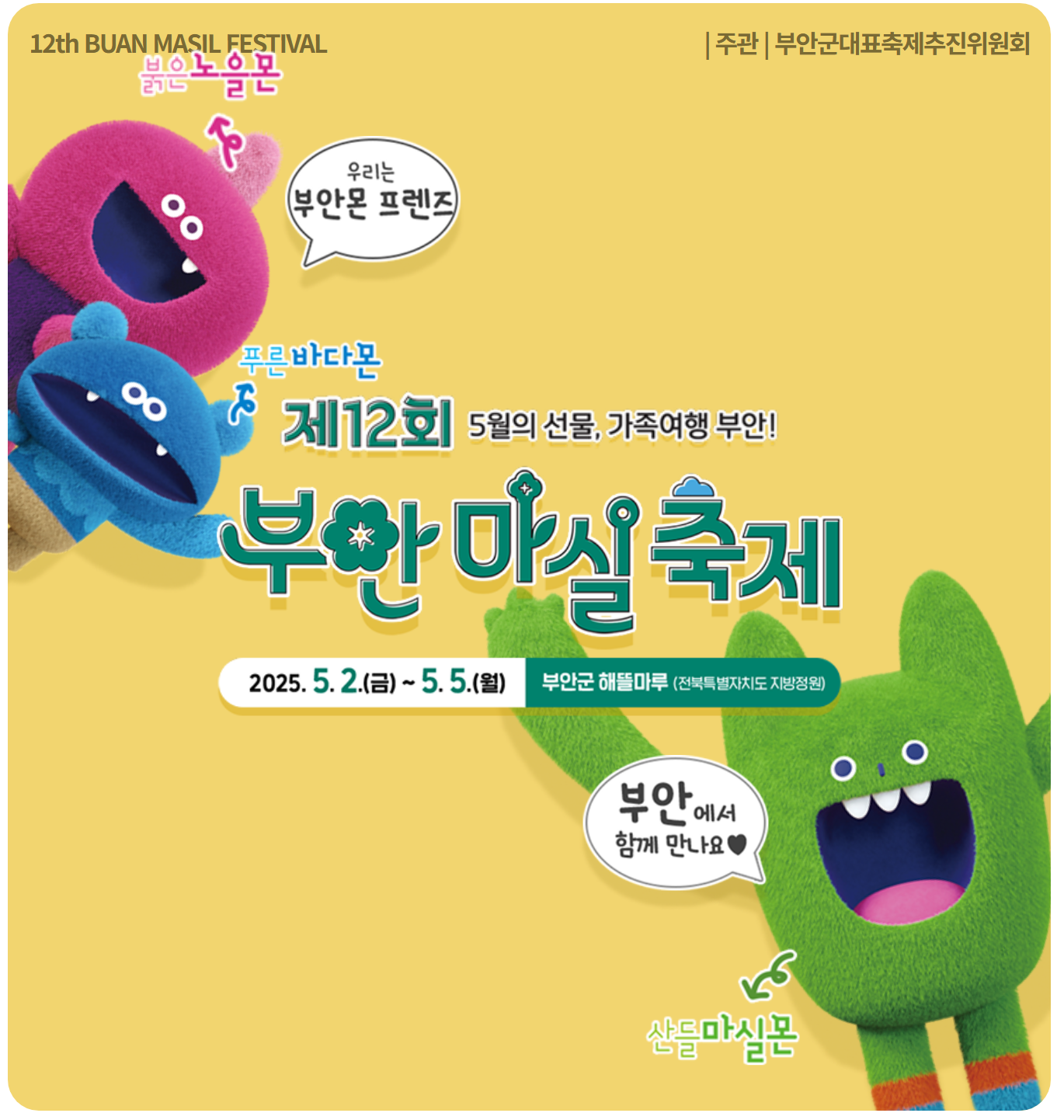 2025 전북 부안마실축제는 전라북도 부안군 해 뜰 마루 지방정원 일원에서 5월 2일(금)부터 5월 5일(월)까지 총 4일간 열립니다. 대표적인 지역 축제로, 다양한 세대가 함께 즐길 수 있는 공연, 체험, 전시, 먹거리 프로그램이 마련되어 있습니다.